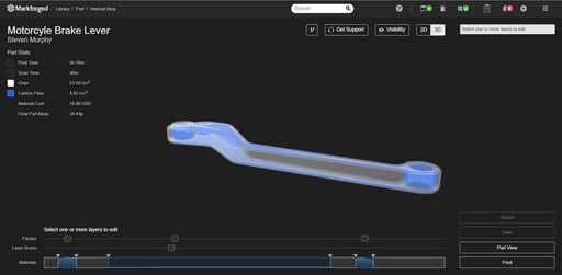 When enabling fiber usage in Eiger, the standard automation of fiber reinforcement does an exceptional job. However, the ability to control fiber layer placement gives you, the user, the option to add strength to the part without overcompensating with fiber or increasing unnecessary part cost. With clever orientation and fiber layouts, you can create very strong, yet cheap parts! Need bolt holes strengthened to resist shear stress? No problem! Want to take advantage of beam bending theory to reduce cost? Takes only a few clicks. This adaptability and maneuverability in the internal view make this one of the highest impacts features with the Markforged printers.