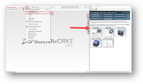 Did you know that SOLIDWORKS has built-in Tutorials to teach you the software? Located under Help (1)> SOLIDWORKS Tutorials (2) > Getting Started (3), there are a series of hands-on tutorials that will walk you through learning the basics of the program.