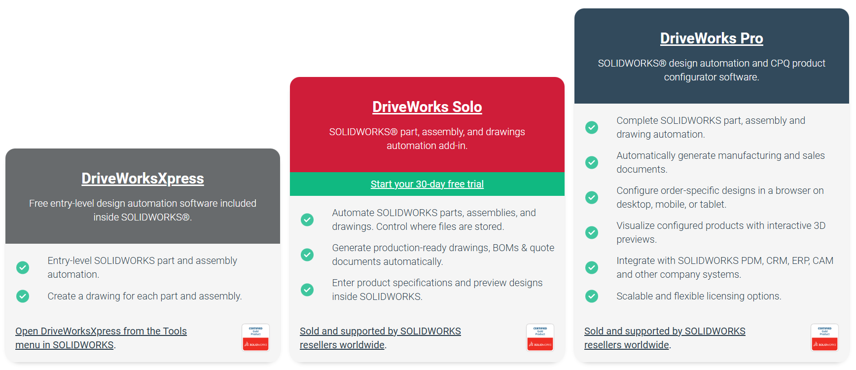 Les niveaux de produits DriveWorks : Xpress, Solo et Pro